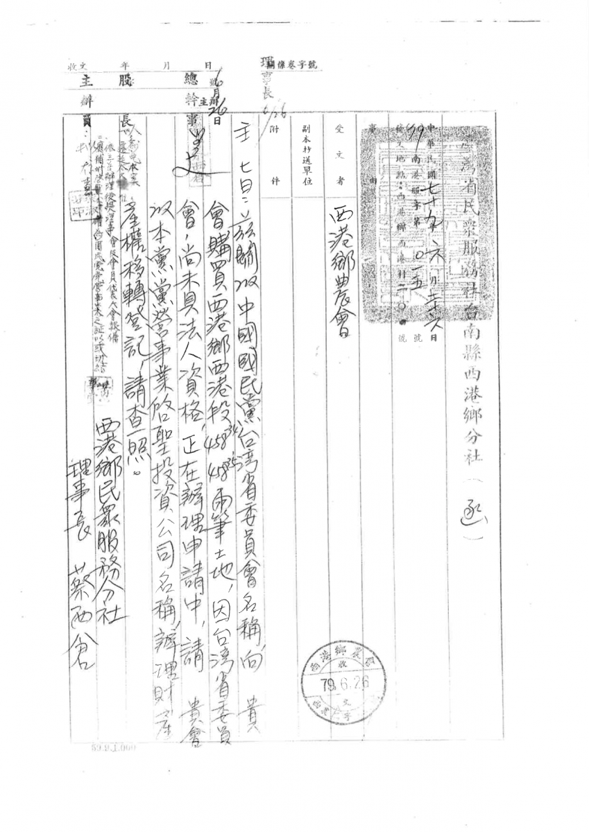 本件史料故事呈顯的,是西港民眾服務社函鄉農會欲以國民黨黨營啟聖公司名義申購此二筆土地之公文。故事亦可見於「政黨不動產查詢系統」網站之「顯著個案」之「【台南市西港區民眾服務社】久占農會地、民服社申購、黨營事業出面買下」。