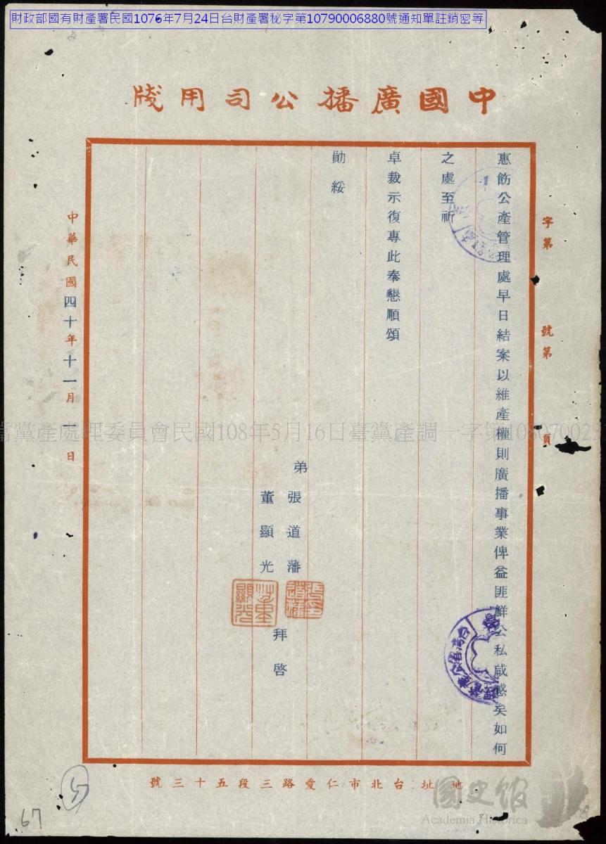 國楨主席吾兄勛鑒:本公司臺灣廣播電台前接收台灣放送協會各處房地產,經由前中央廣播事業管理處報呈中央財務委員會轉送行政院核定後,送由前國防最高委員會常務會議核准轉帳其轉帳手續並經台灣台先後電請