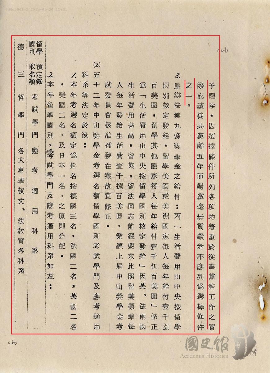 其中值得注意的是,以往報考資格中訂有黨齡五年以上之限制,亦即入黨不滿五年之青年學生,並無資格報名應考該項考試。經該年度中山獎學金委員會討論後,決定予以刪除。從中山獎學金委員會所陳理由「選擇條件所列各項均着重於從事黨務工作之實際成績,徒具黨齡五年而對黨毫無貢獻者不應列爲選擇條件」看來,該獎學金之選拔標準,除各學科成績之要求外,對國民黨的貢獻也在考量之列。