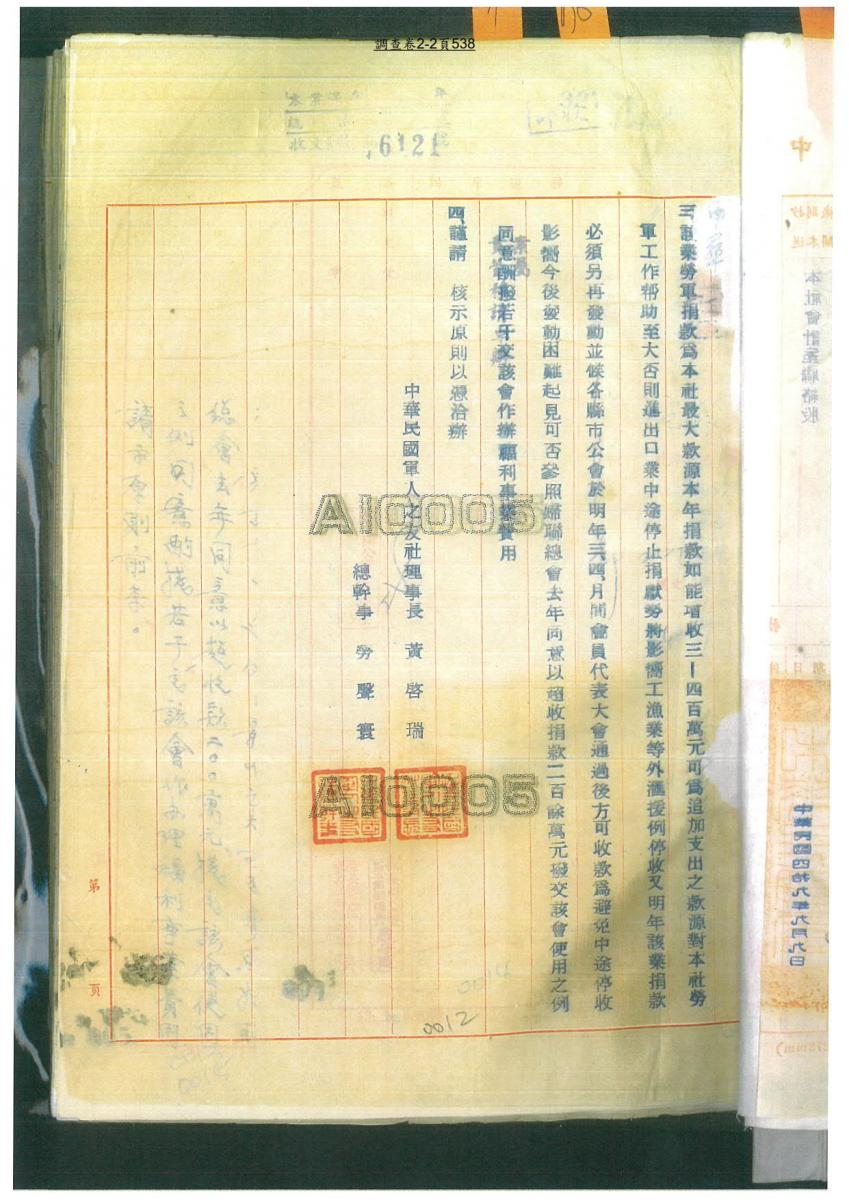 因此,婦聯會與軍友社「請」省進出口公會召開理監事會議,覆議(編按:原文為「複議」)前次理監事會中至9月底即停止「捐獻」之決議。公文中同時提及,因為超收之「捐款」應以何種比例分配,還未得省進出口公會提出具體意見,因此婦聯會、軍友社無從協議。在省進出口公會尚未將具體意見讓婦聯會、軍友社呈報「上級」得到核准之前,該二團體也不便使用。婦聯會與軍友社這份公文之末,不忘表明公文副本將會抄送「中央委員會第五組」、政五處與台灣省黨部。